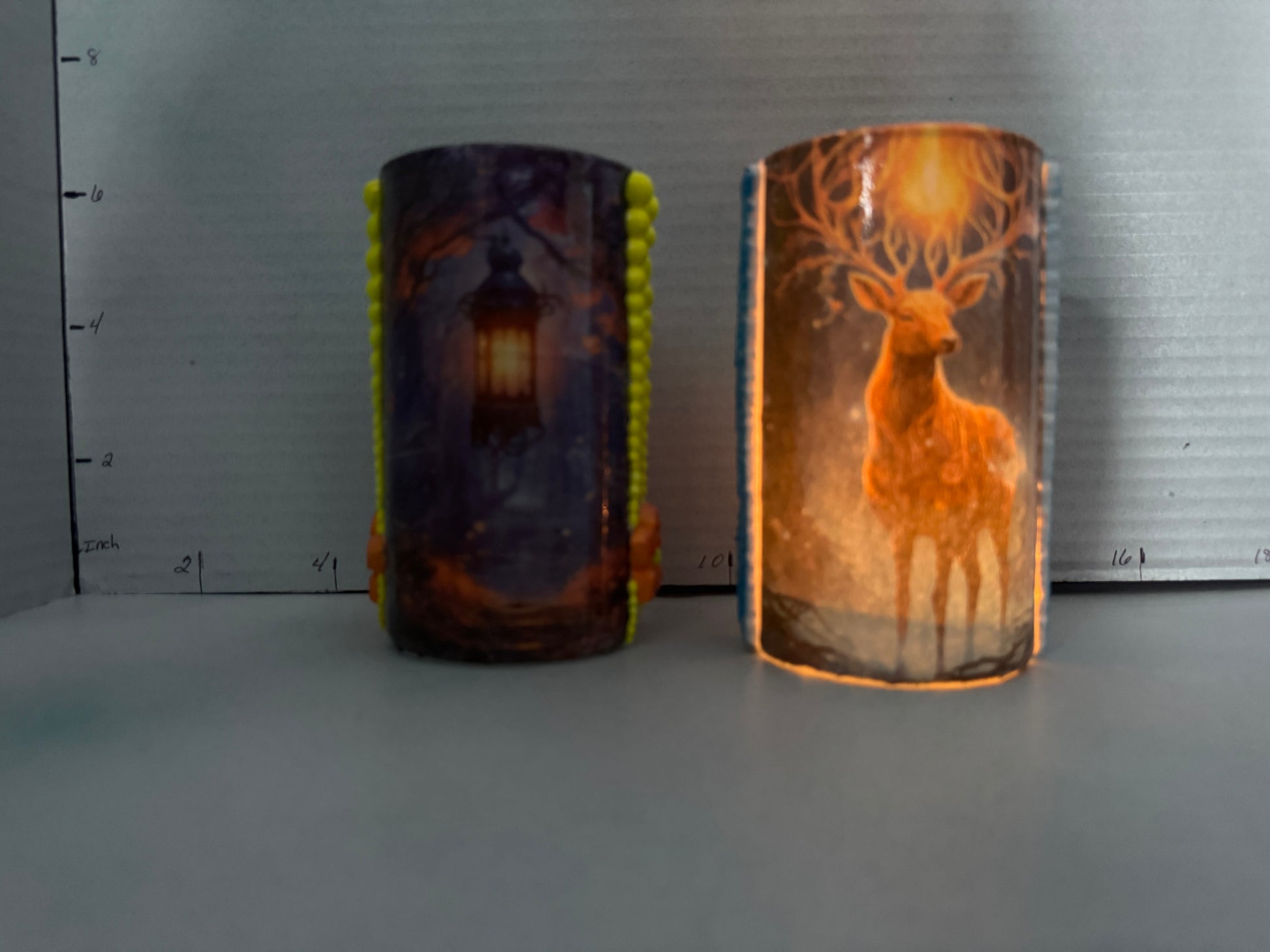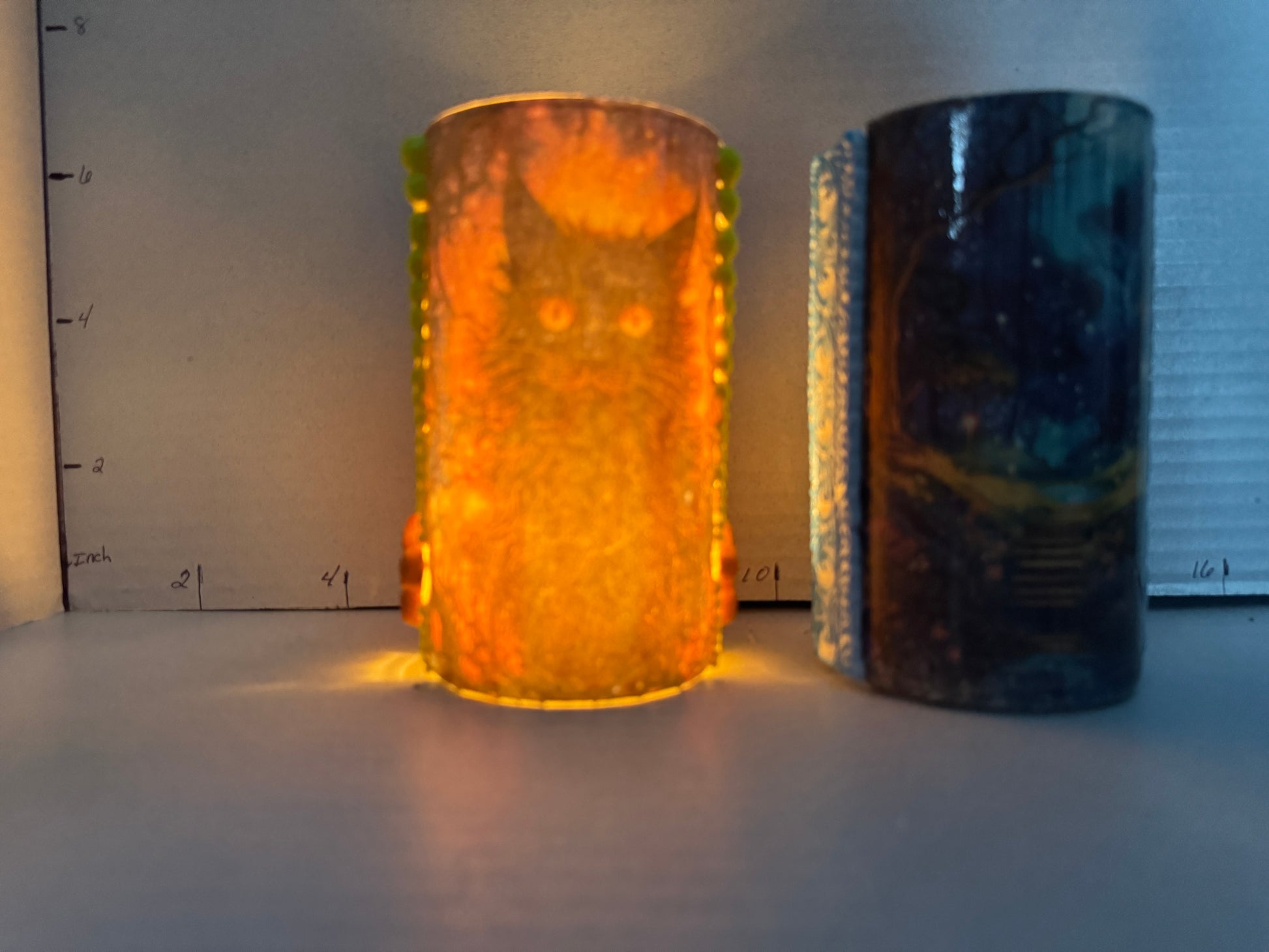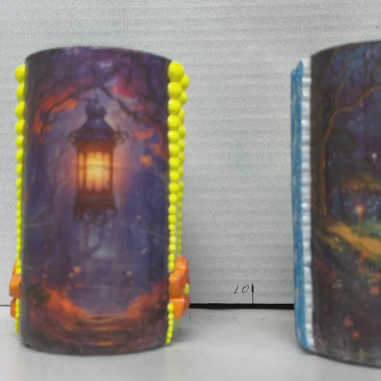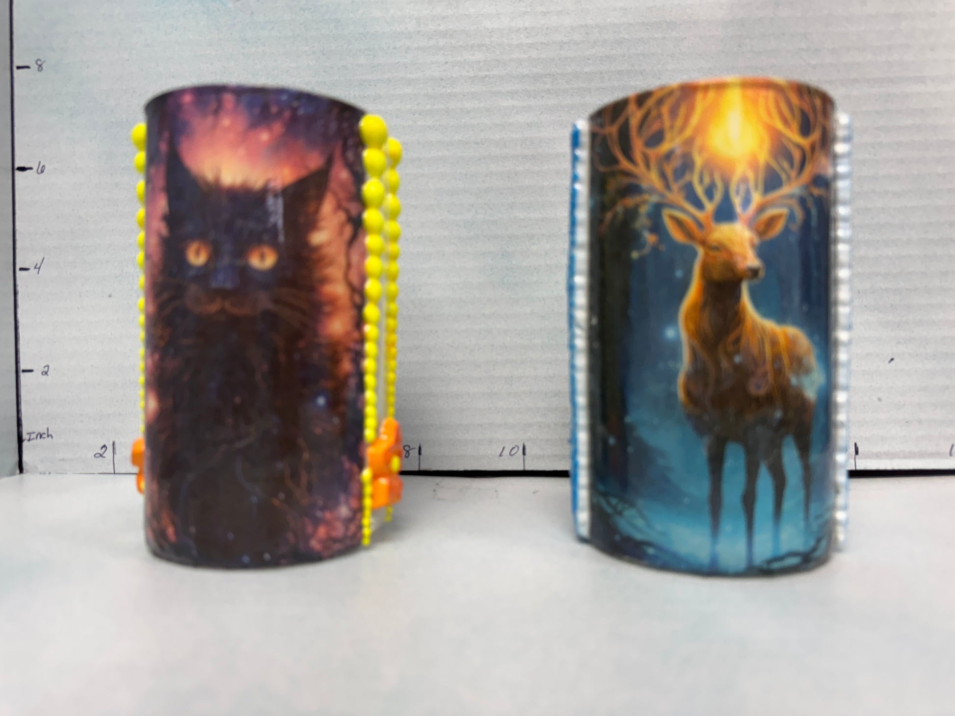 This versatile cylindrical glass can serve as a stylish pencil holder in your office or as a charming tea light holder to create a cozy ambiance in your bedroom. One glass features a black cat on one side and a scenic design on the other, while the second showcases a buck on one side paired with a complementary scenic view. Crafted to blend functionality with decorative appeal, these glasses add a subtle artistic touch to any space.