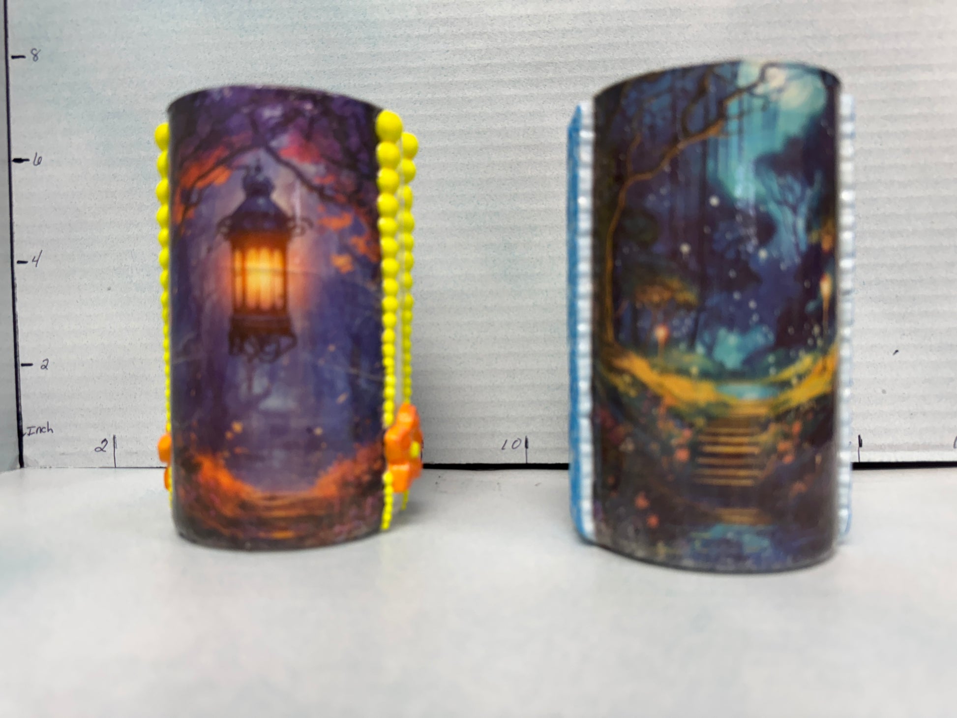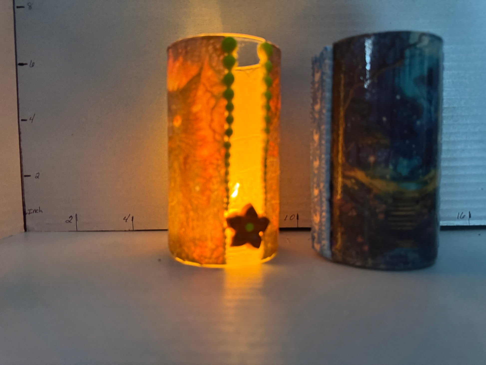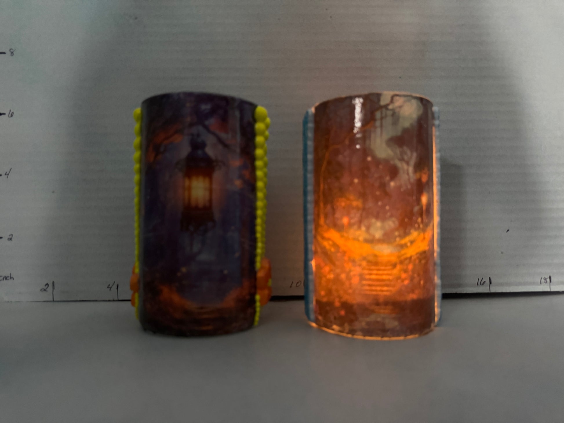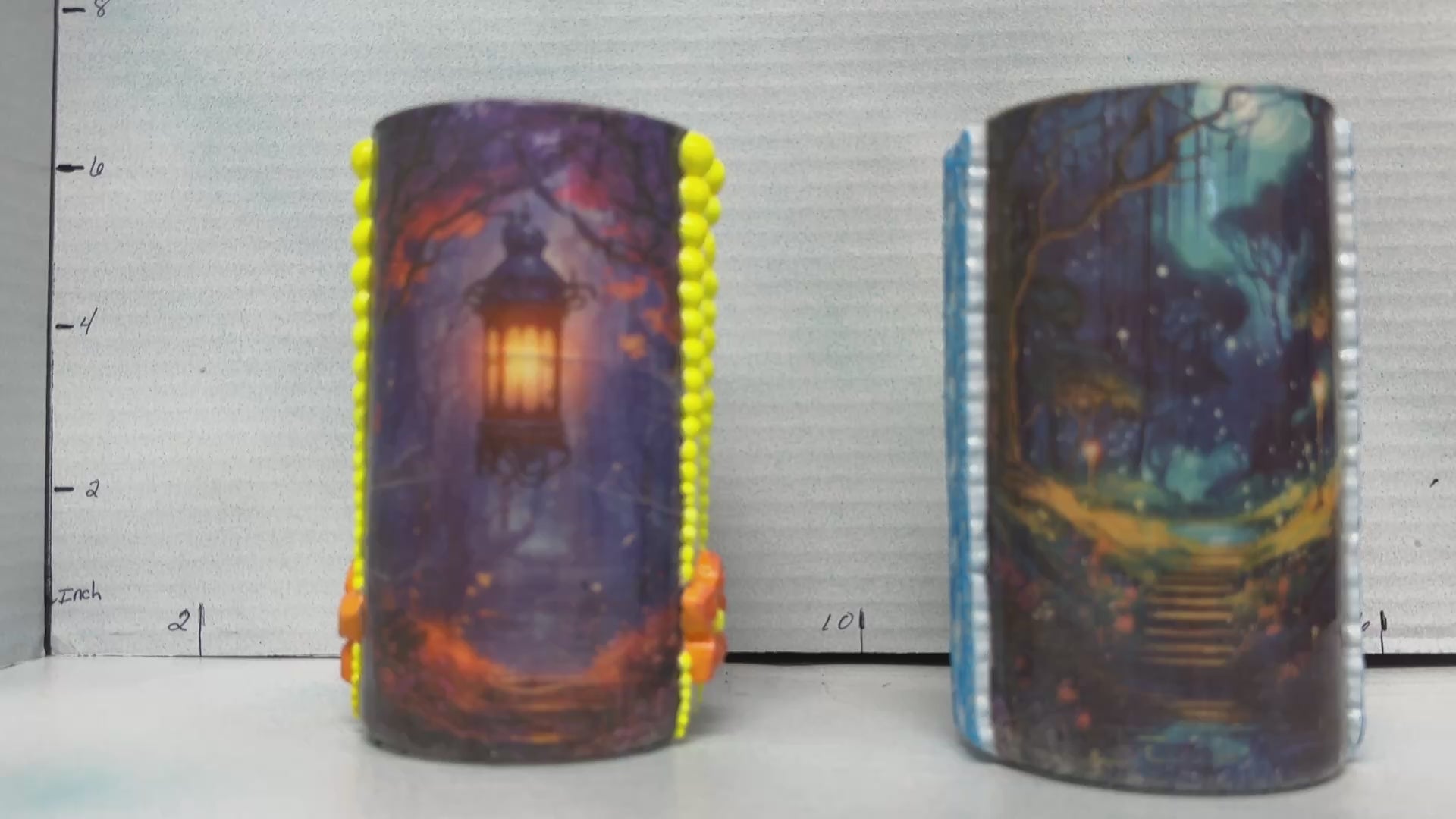 This versatile cylindrical glass can serve as a stylish pencil holder in your office or as a charming tea light holder to create a cozy ambiance in your bedroom. One glass features a black cat on one side and a scenic design on the other, while the second showcases a buck on one side paired with a complementary scenic view. Crafted to blend functionality with decorative appeal, these glasses add a subtle artistic touch to any space.