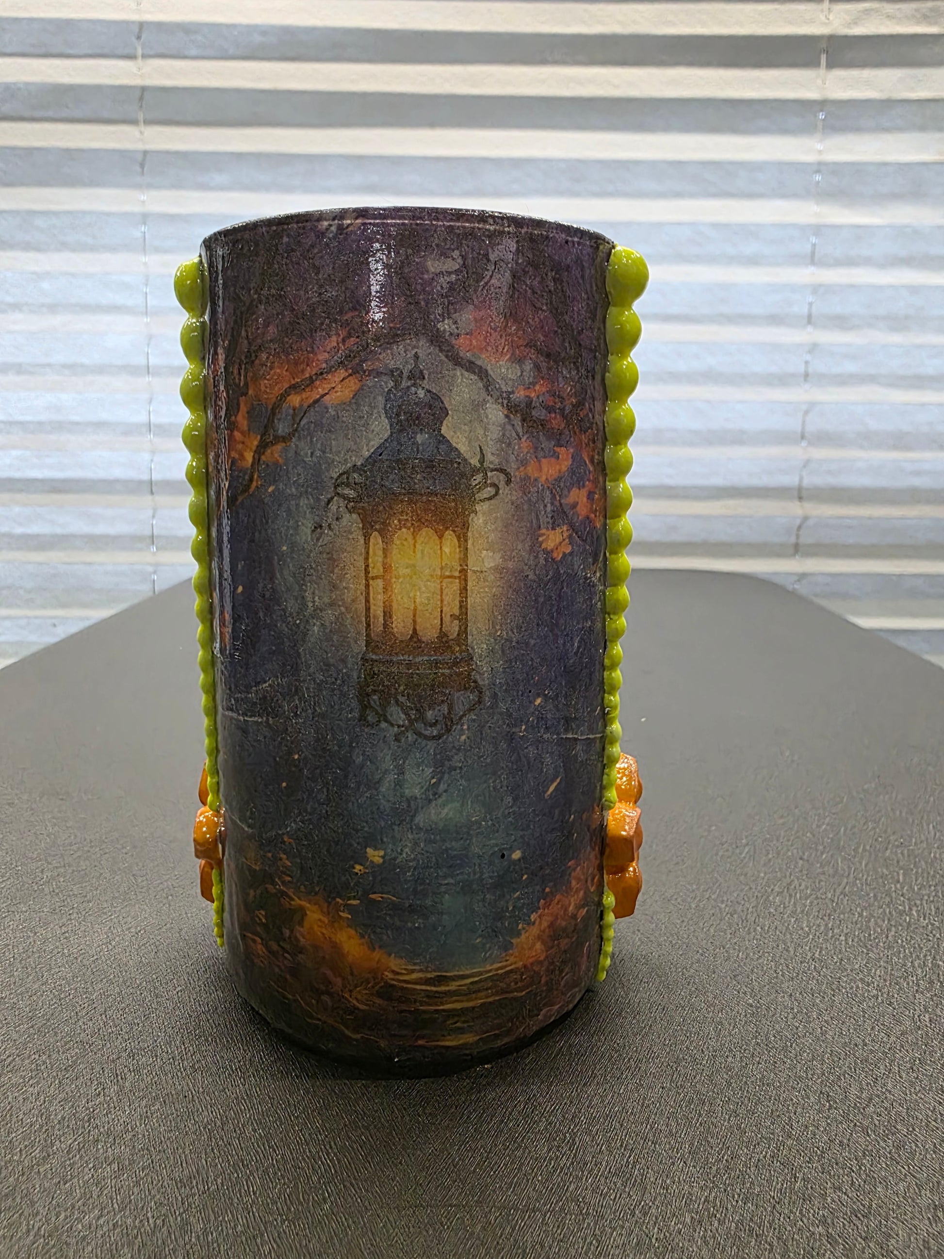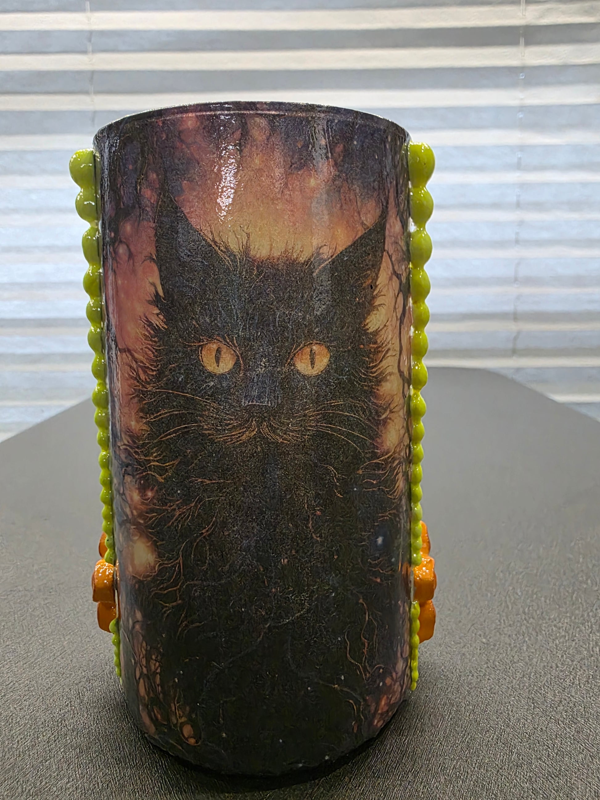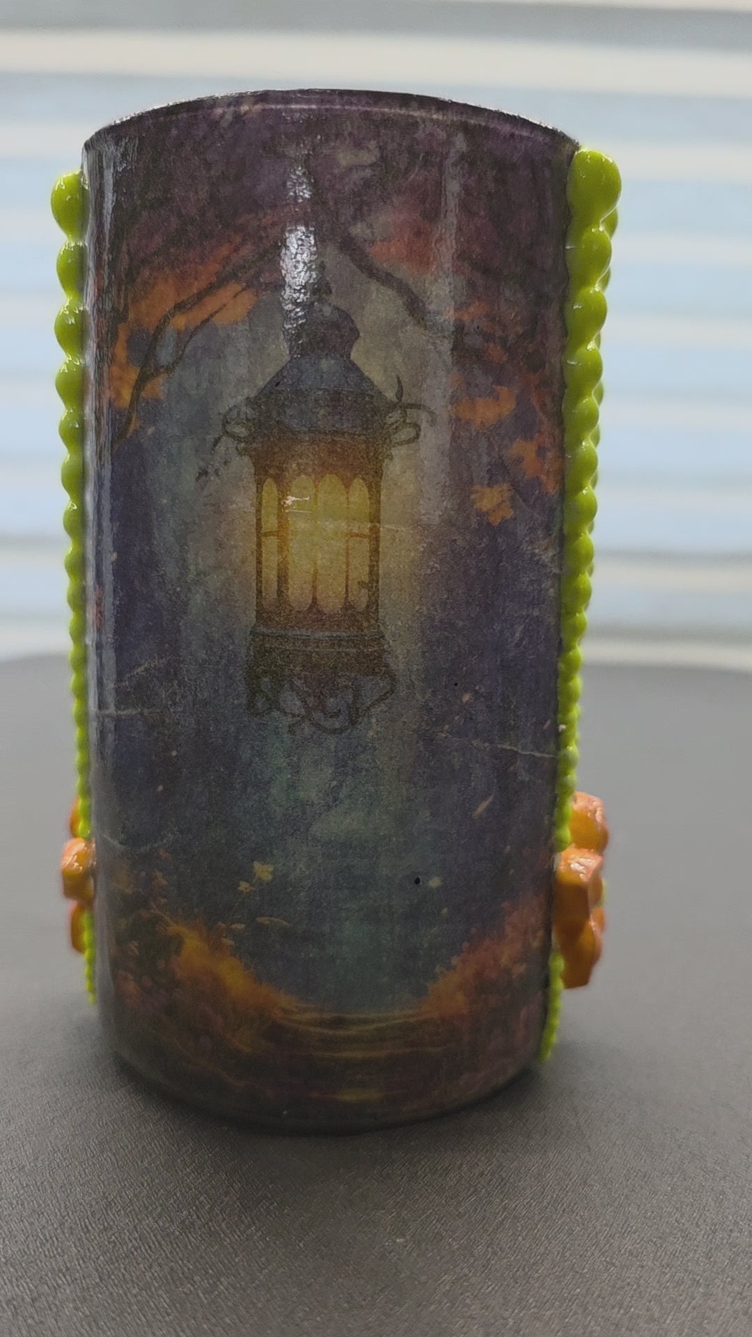 This artistic piece features a detailed fuzzy black cat on one side, elegantly contrasted by a delicate scene of a softly glowing lantern against an evening fall night backdrop. The warm tea light inside the lantern enhances the ambiance, framed by creatively designed edges that blend both elements seamlessly. The composition captures a serene, mysterious mood, perfect for adding a touch of subtle intrigue and autumnal charm to your space.