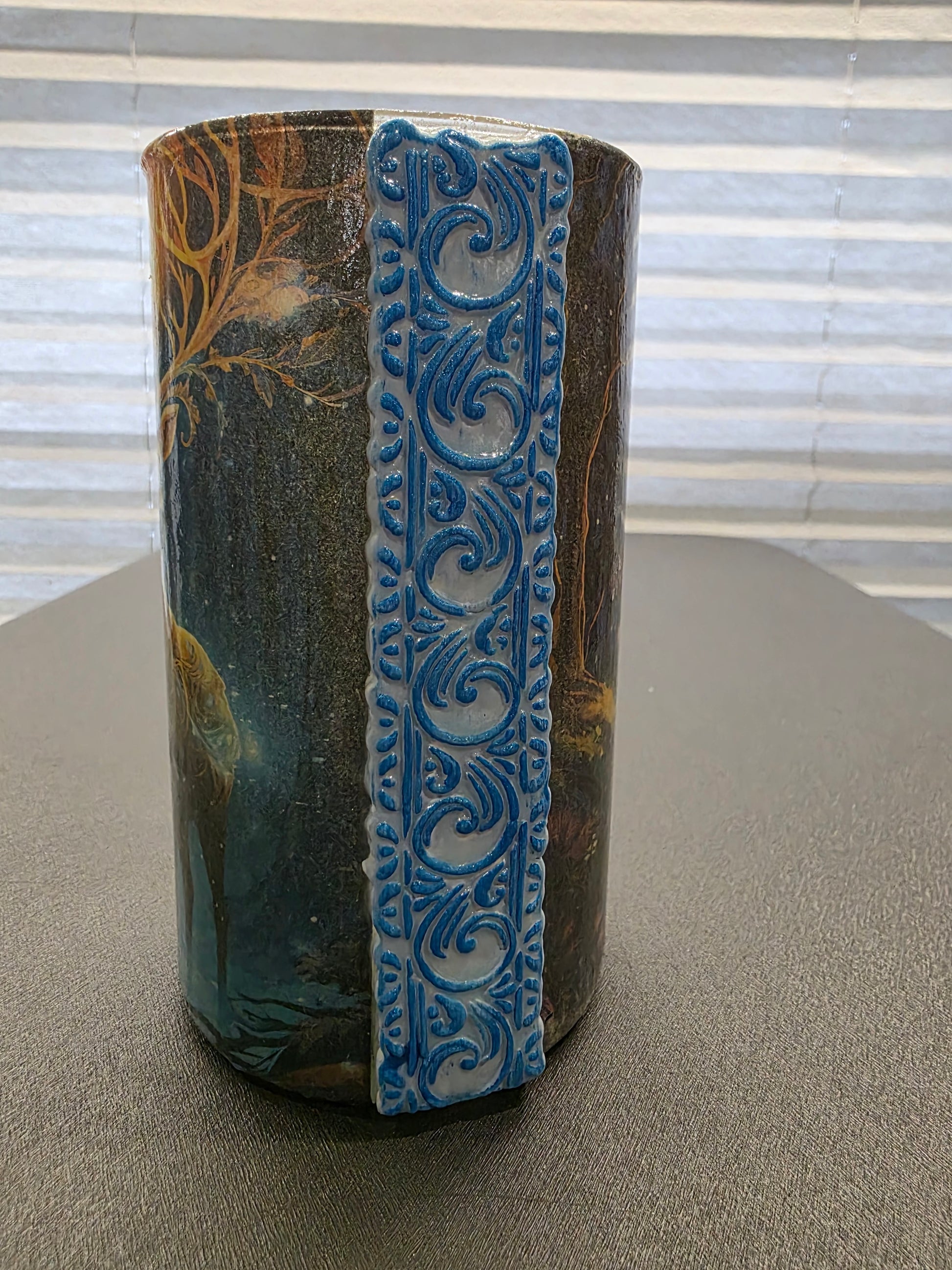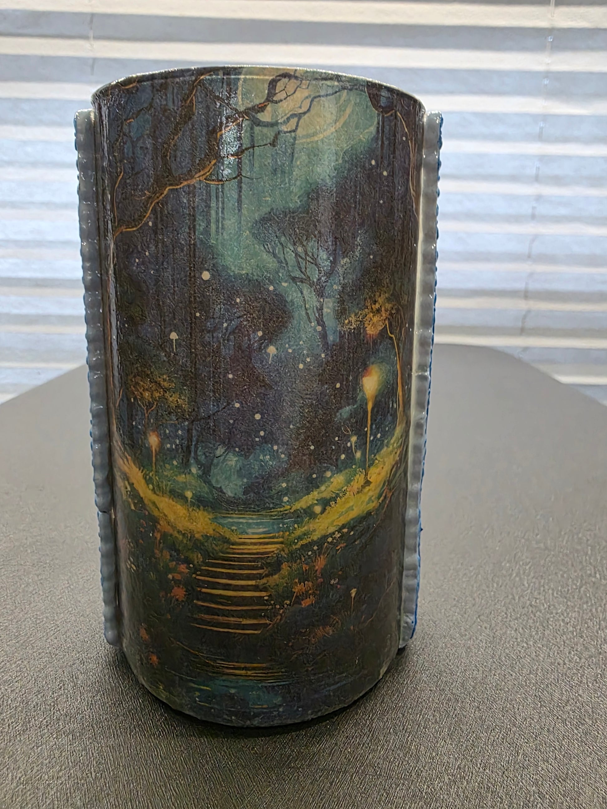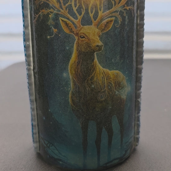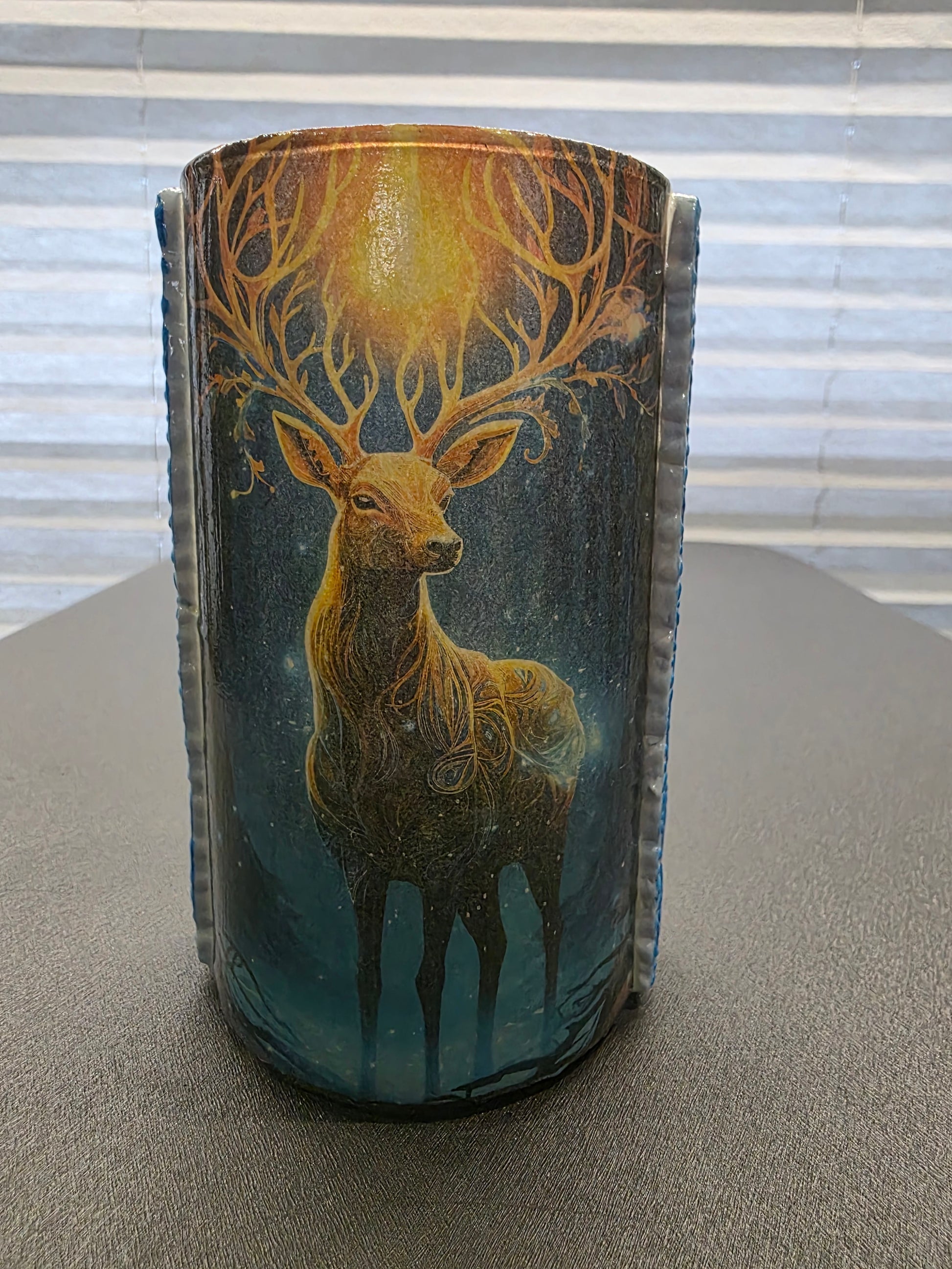 This artwork captures a majestic buck overlooking his field during a tranquil evening. The scene features gentle steps leading up to a serene pond, bordered by a striking blue edging that enhances the natural beauty. The composition offers a peaceful glimpse into wildlife at dusk, blending natural elements with calm tones that evoke a deep sense of quiet reflection and harmony with nature. Perfect for those who appreciate subtle tranquility and expert artistry in capturing serene outdoor moments.