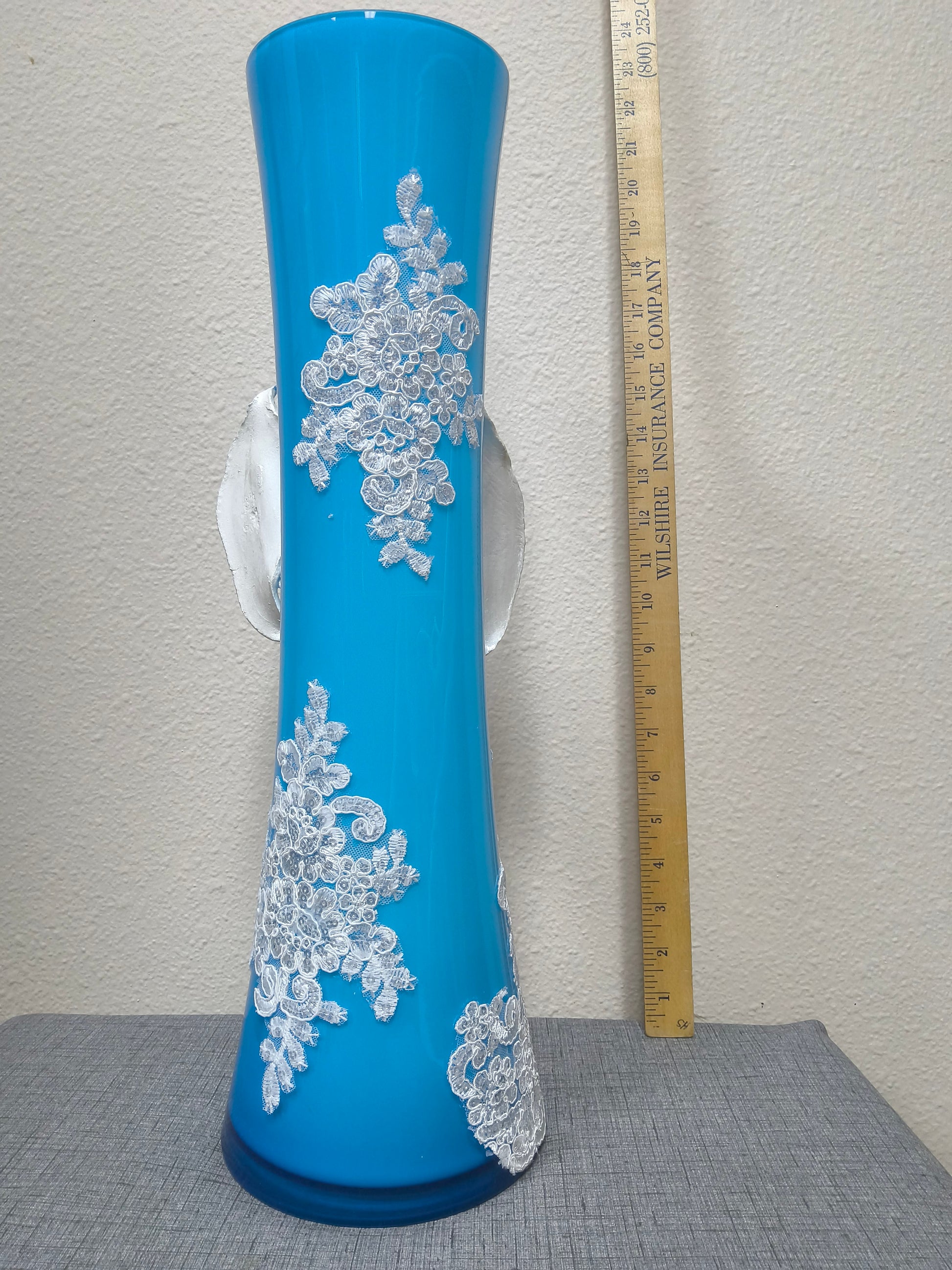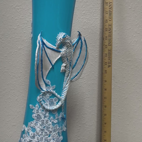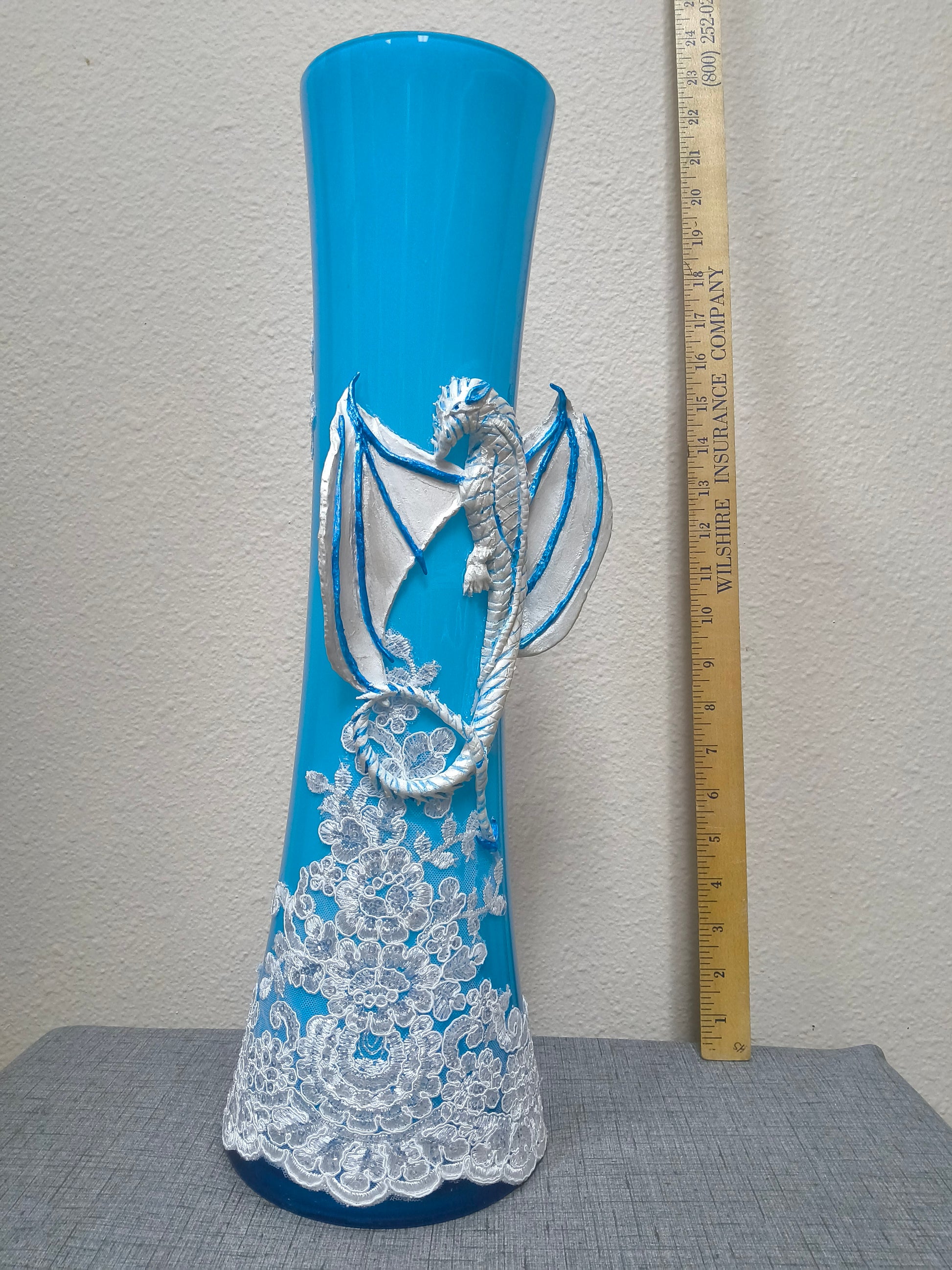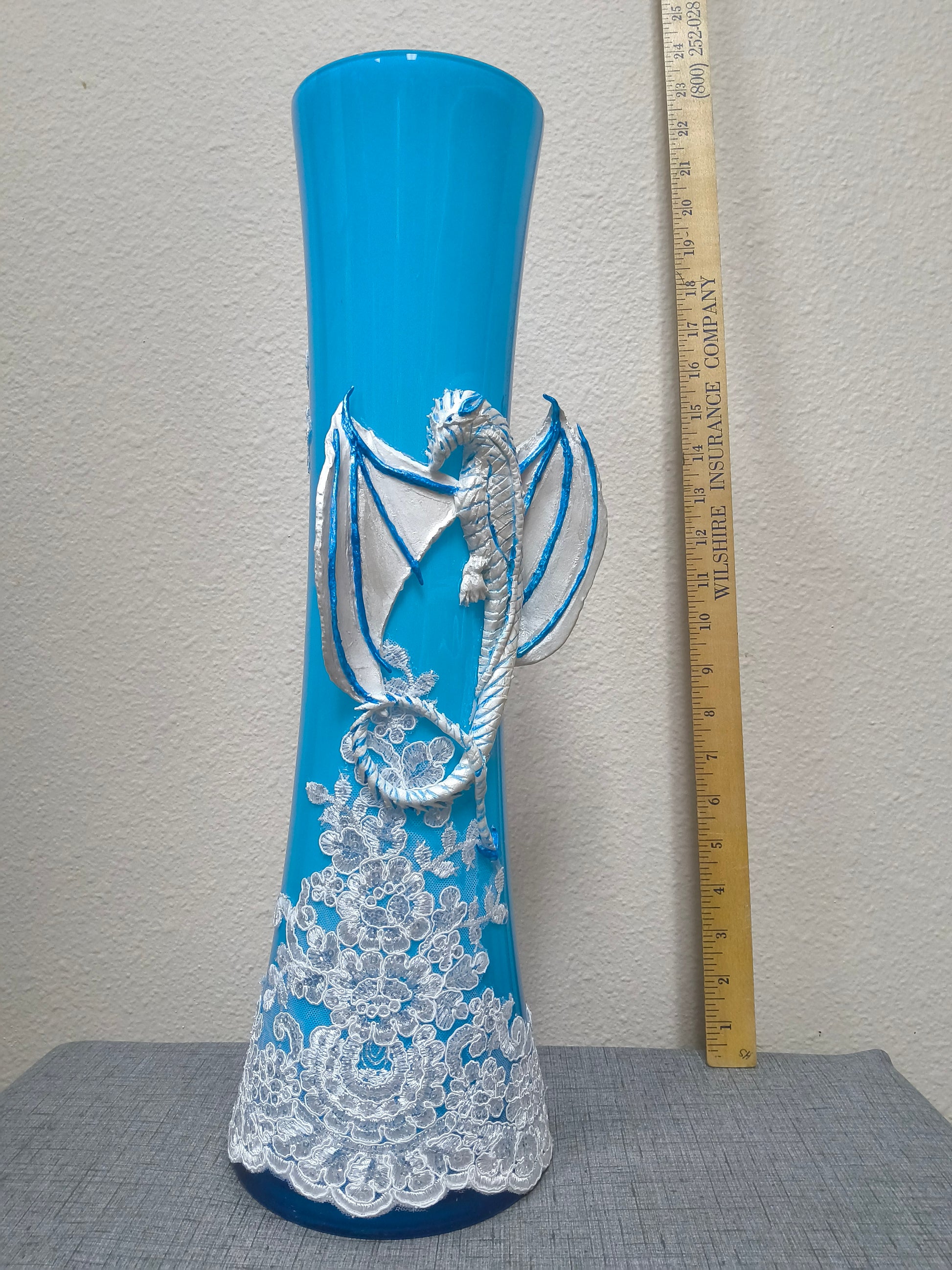This striking glass vase features an intricately sculpted white dragon with brilliant blue highlights, adorned with delicate lace accents. The dragon gracefully nestles against a gradient blue background that transitions across the vessel's surface, creating depth and movement. A true statement piece that merges functional design with artistic expression, this one-of-a-kind creation showcases masterful glasswork and sustainable artisanal craftsmanship.