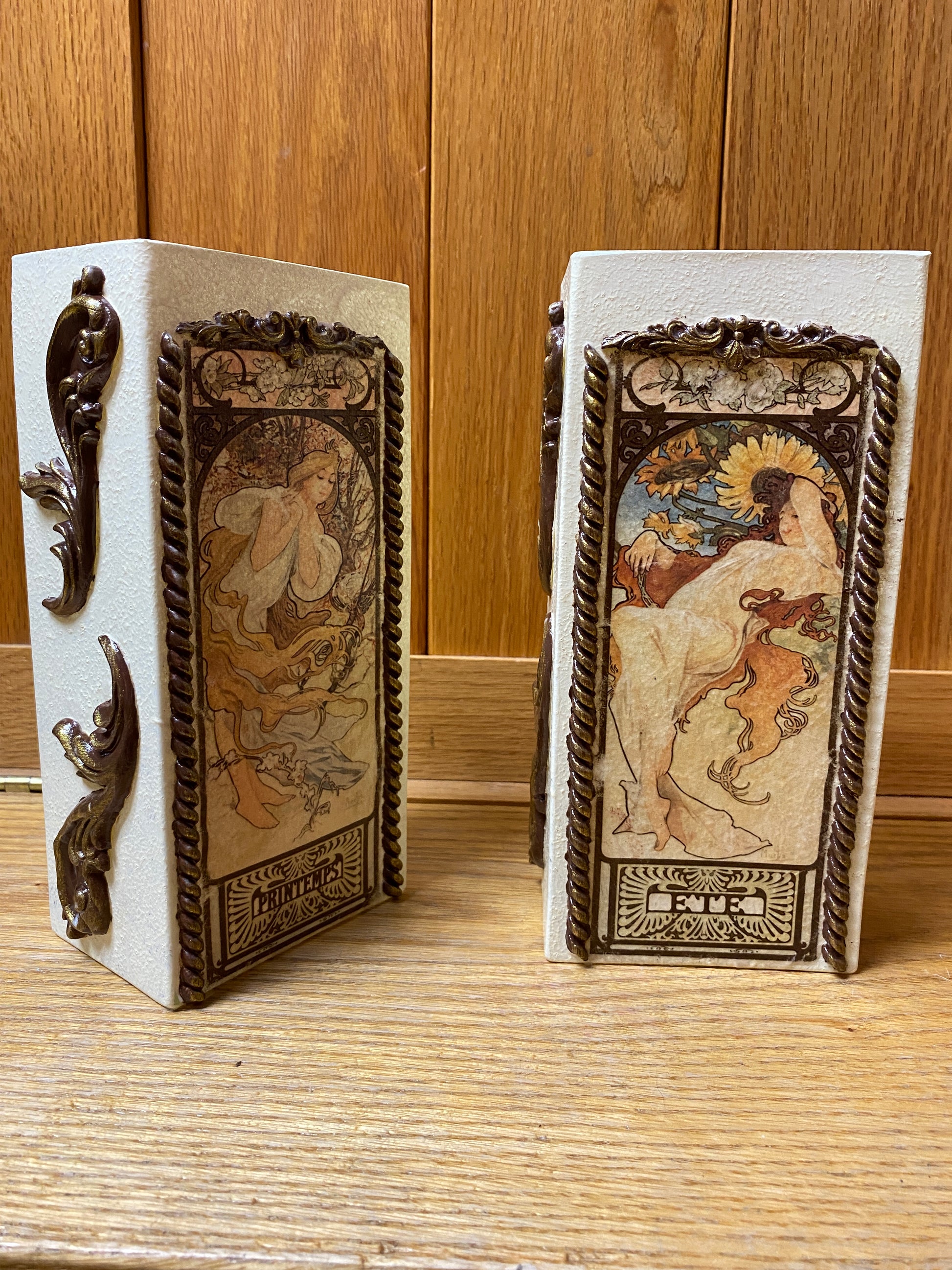 This set of two features four charming ladies, with two figures on each piece, each holding fresh or dried flowers or items of your choice. Expertly crafted, these decorative accents bring a playful yet elegant touch to your space, perfect for showcasing natural beauty and personalized style. Ideal for collectors or as a unique gift, they add warmth and character to any room.