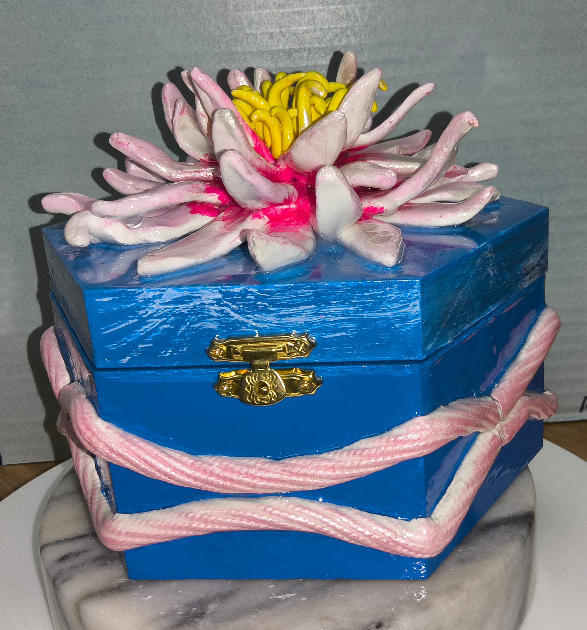 Octagonal wooden box crowned with an oversized sculptural flower featuring a vibrant pink center that gracefully transitions to softer pink tones at the petal edges. This striking piece merges functional storage with artistic statement—ideal for displaying on shelves, dressers, or as a decorative accent. The geometric base provides stability while the dimensional floral crown draws the eye. Perfect for those who appreciate handcrafted details and one-of-a-kind design elements that elevate any room's aesthetic.