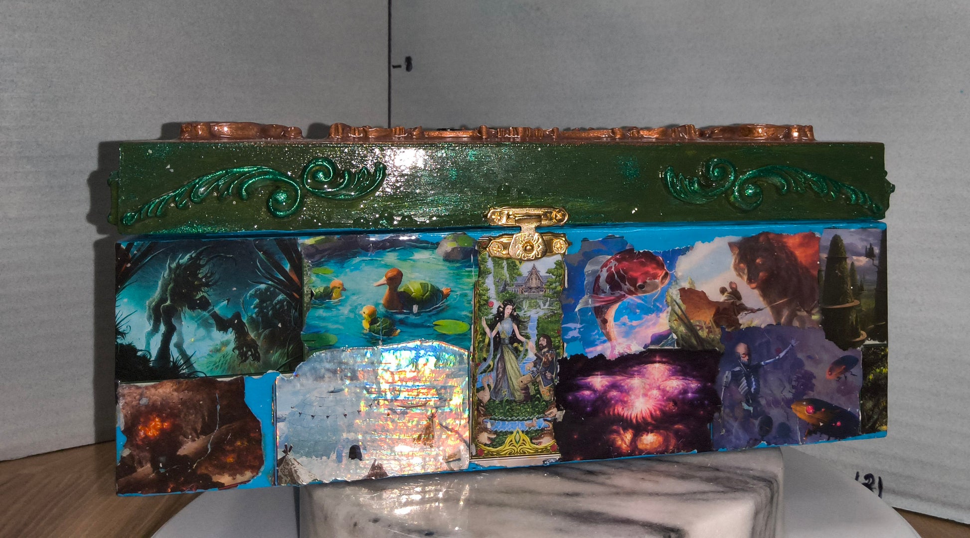 Magic? A box to store your collection with style. This handcrafted wooden box combines functional card storage with striking visual appeal—featuring detailed card imagery on the exterior and an ornate baroque-inspired design crowned with the iconic Magic circle. The instantly recognizable aesthetic makes it both a practical organizer and a display-worthy piece for any collector's shelf.