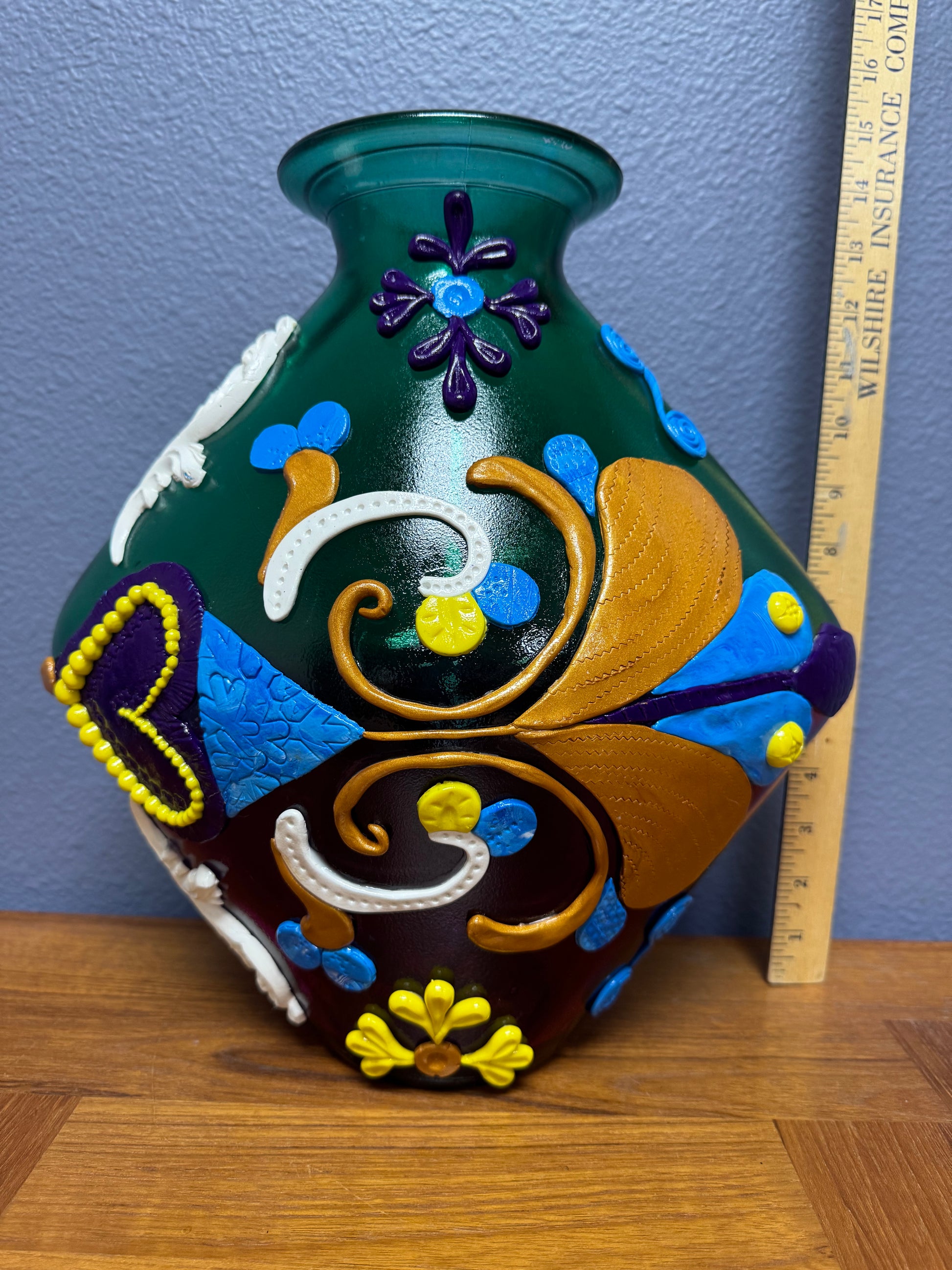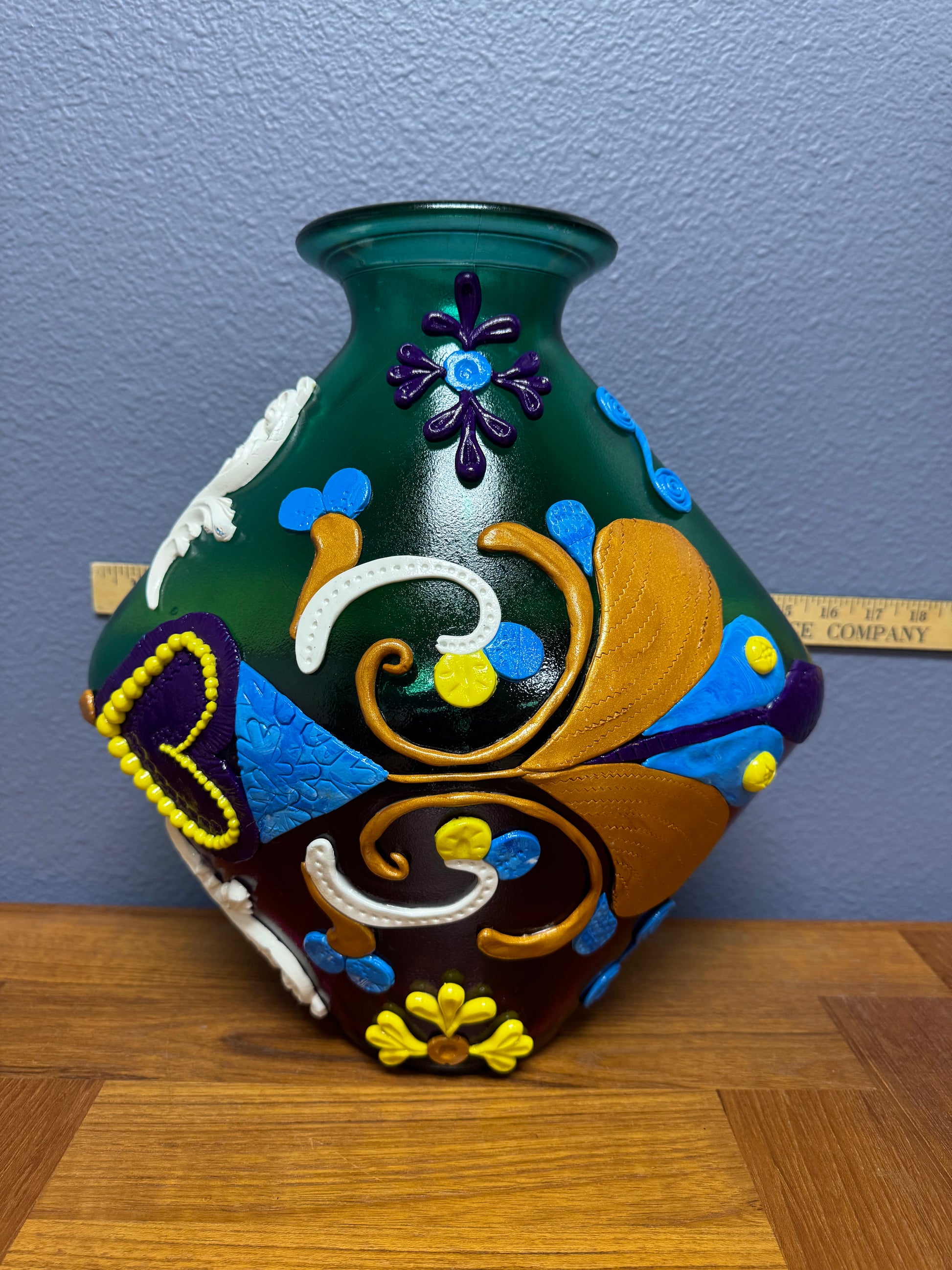 Multi tone teal and pink colored vase an unique abstract mirrored deign from top to bottom.