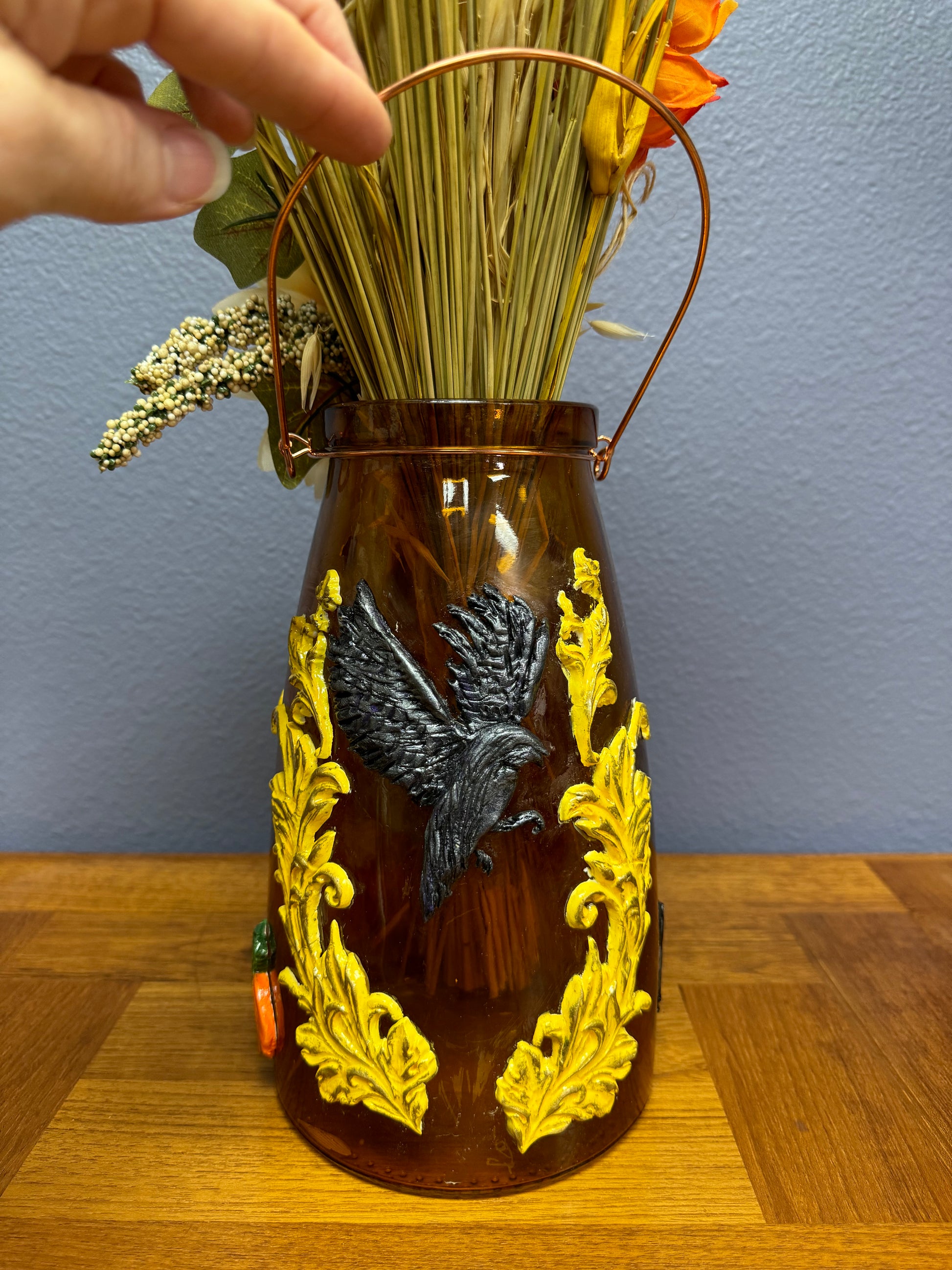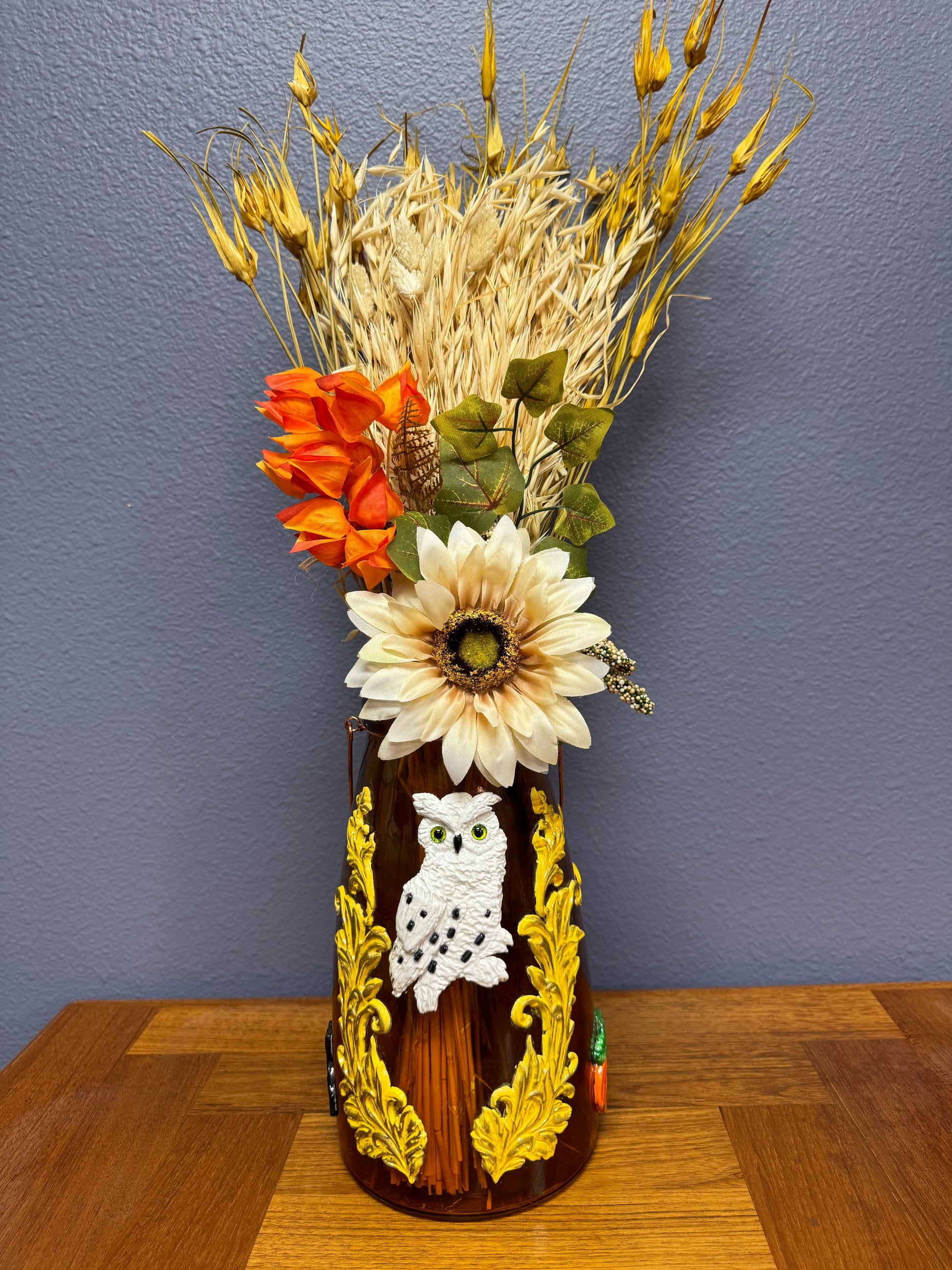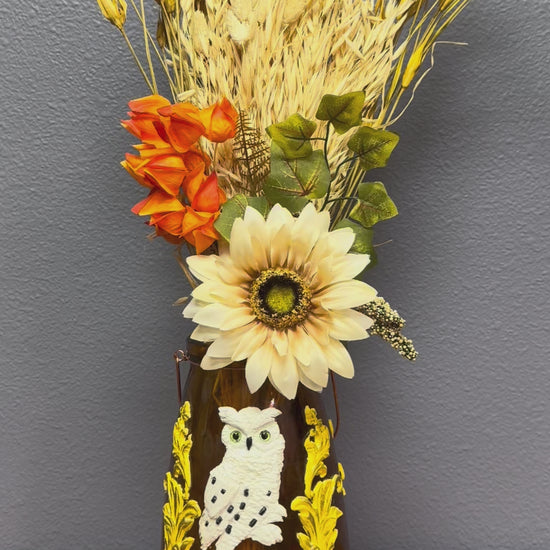 This orange-tinted glass lantern features a detailed white owl on one side and a raven on the other, creating a striking contrast. Ideal for displaying fresh or dried flowers, or as a candle holder, it adds a warm, atmospheric glow to any space. Its unique design combines functionality with artistic appeal, making it a versatile decorative piece for your home or special occasions.
