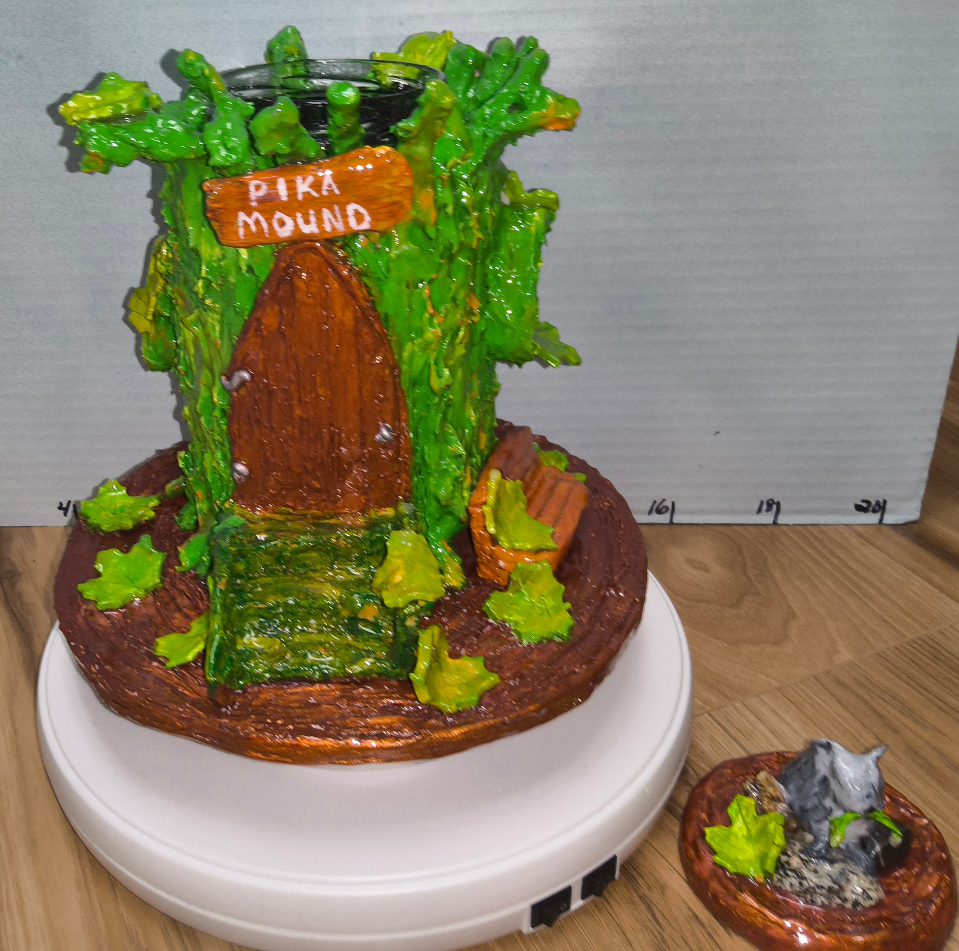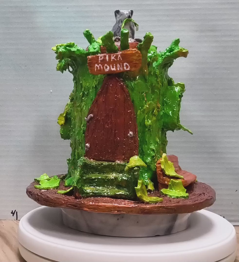 # Pika Mound Welcome a whimsical woodland scene into your home with this handcrafted fairy house. Featuring a charming pika perched atop the tree trunk, surrounded by autumn foliage and a welcoming bench, each piece captures the magic of nature's smaller inhabitants. Crafted on a repurposed glass base with meticulous detail, this one-of-a-kind creation serves as both functional décor and a conversation starter. Perfect for displaying on a shelf, mantel, or garden table—a delightful escape into enchanted miniature worlds.