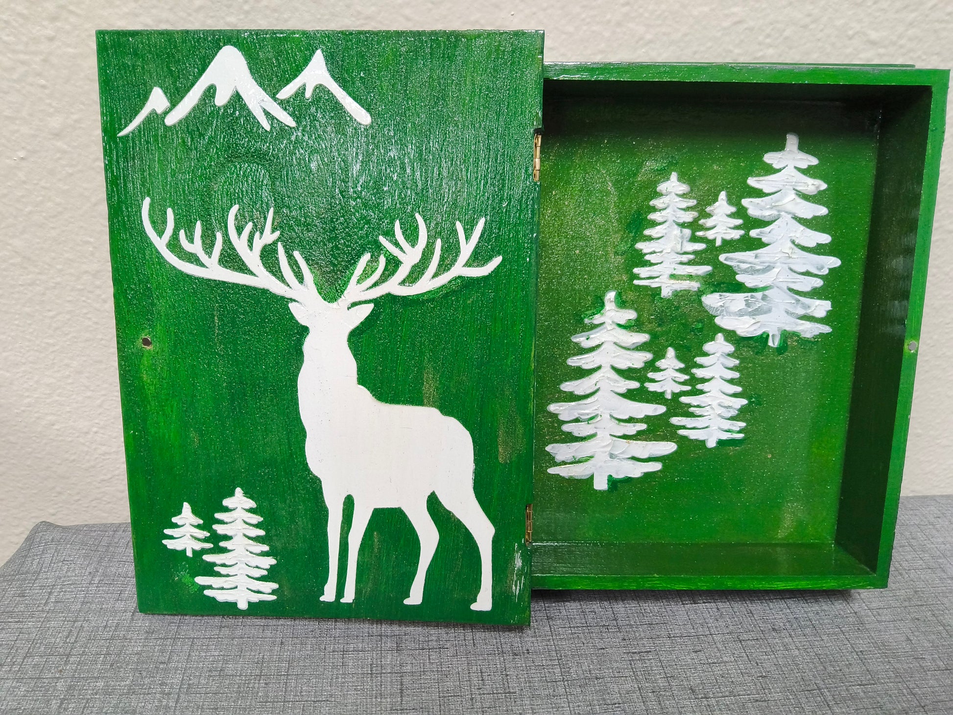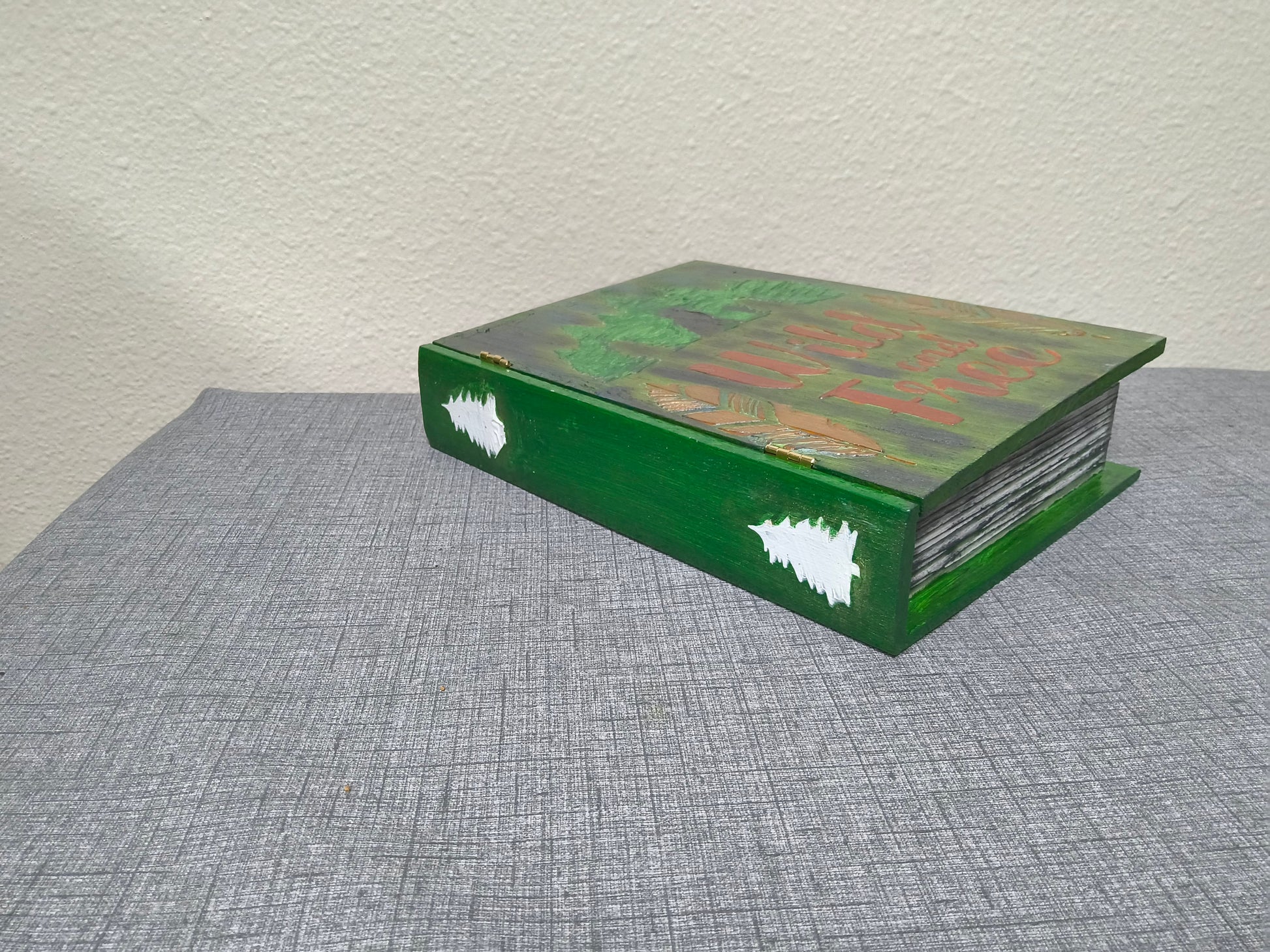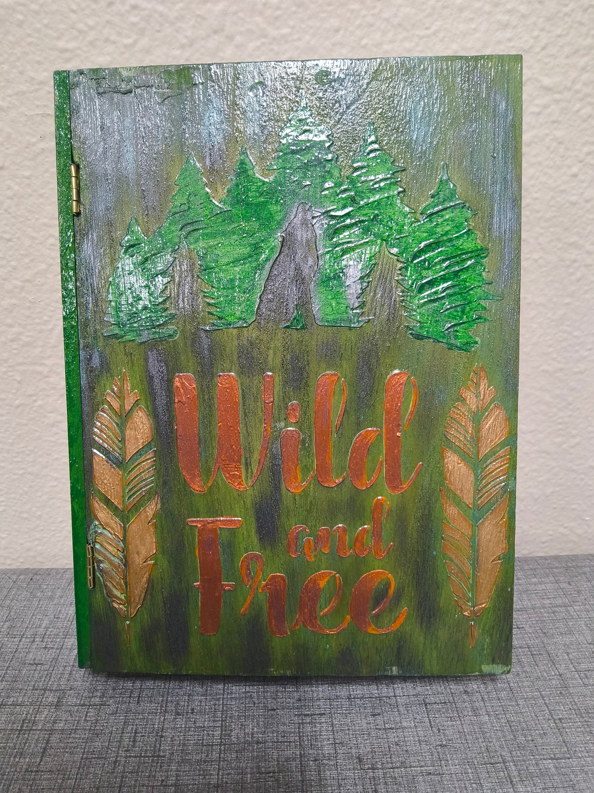 # Wild and Free This striking box-book merges functional art with nature-inspired design. The exterior features a wolf howling in the forest landscape, while the interior reveals an intricate scene of a buck amid towering trees. Perfect for collectors who appreciate layered storytelling and craftsmanship, this piece celebrates wildlife and wilderness in a format that invites exploration. Each opening unveils new details, making it an engaging conversation piece for shelves or display tables.
